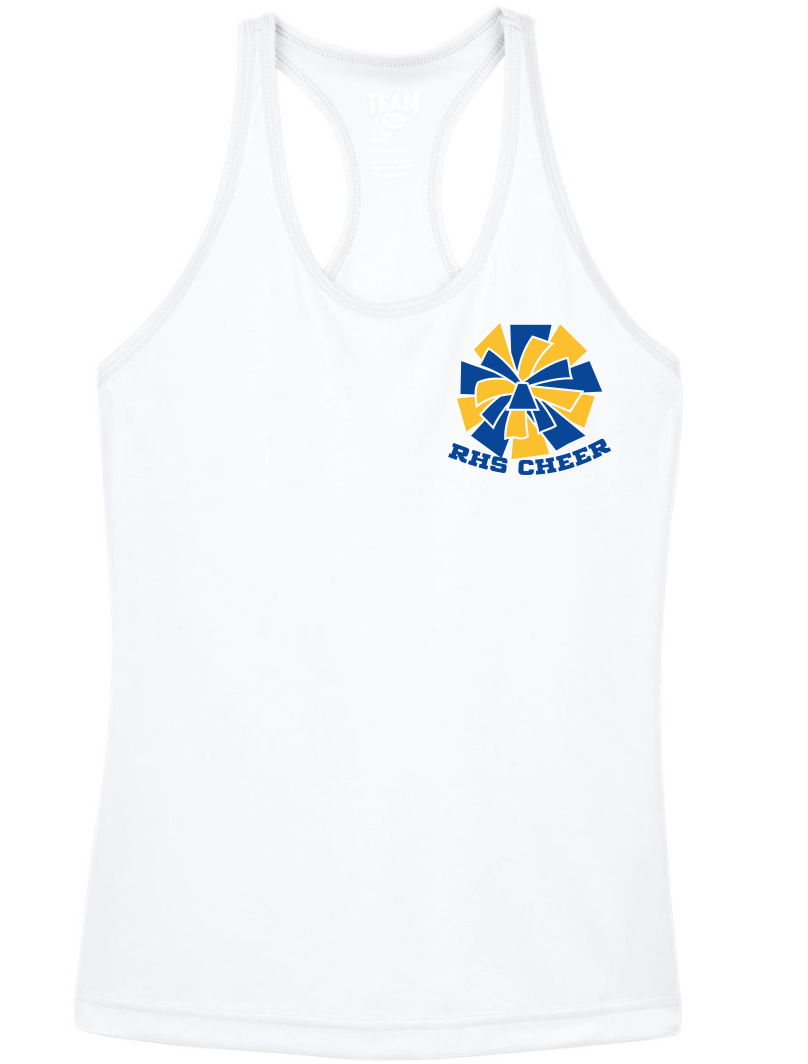 White 100% Polyester Tank Top with 'RHS Cheer' Design on the front left chest in blue and yellow. Available in XS-2XL.